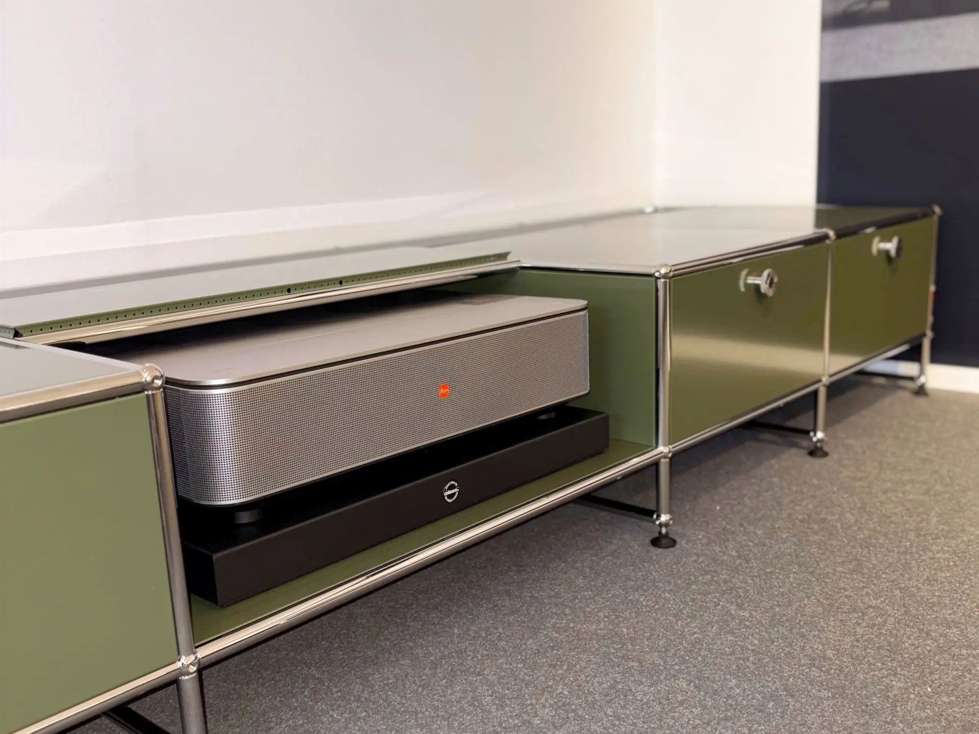 In unserer Ausstellung in Verl zeigen wir die perfekte Symbiose: das USM Haller Sideboard in Kombination mit dem Kurzdistanzbeamer von Leica. Überzeugen Sie sich selbst von der Qualität und gestalten Sie ein individuelles Möbel, das sich Ihren Anforderungen anpasst.